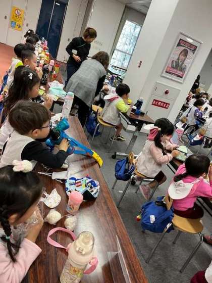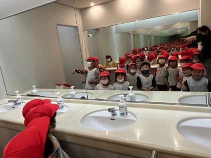 その後、トイレで手を洗っているときにあか組が「見て」「発見」と鏡を見てはしゃいでいました。鏡の前にも後ろにも自分たちが奥の方まで写っていて、大喜びでした。
