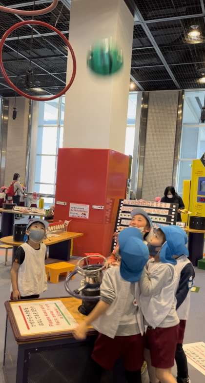 空気によって飛ばしてスイカのボールを上の輪に通すのですが、一緒に遊んでいた小さいお友達にボールを渡してあげて、優しいあお組でした。