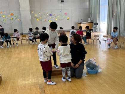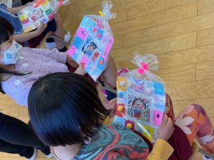 あお組の修了が近づいてきて、お世話になったことを思い出して、プレゼントを作りました。1人ずつお礼を言いながら、渡しました。お別れ会を開いて、思い出を話したり、歌を歌ったり、お礼を言ったりしました。自分の絵が入った写真立てを嬉しそうに眺めているあお組でした。