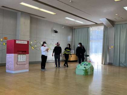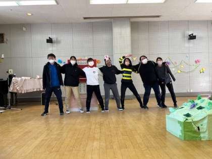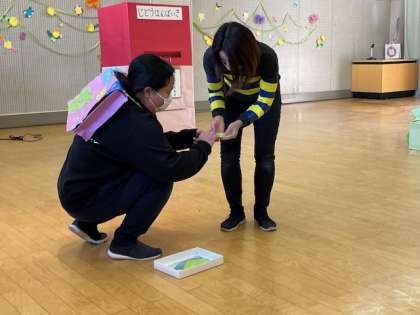 先生たちもあお組を祝って、劇をしました。『ぽんたの自動販売機』は葉っぱを入れてほしいものを言ったら出て来るんだって。こぶたちゃんは花壇にお花を咲かせたい、エルマーとリュウはみかんとみかんの皮が欲しいとお願いをしました。でも、もっと友達がいっぱいいたらいいのになとお願いすると、困ったぽんたは、住吉幼稚園の先生たちを呼びました。みんな仲良しになれて、よかったo「みんなともだち」ですね。