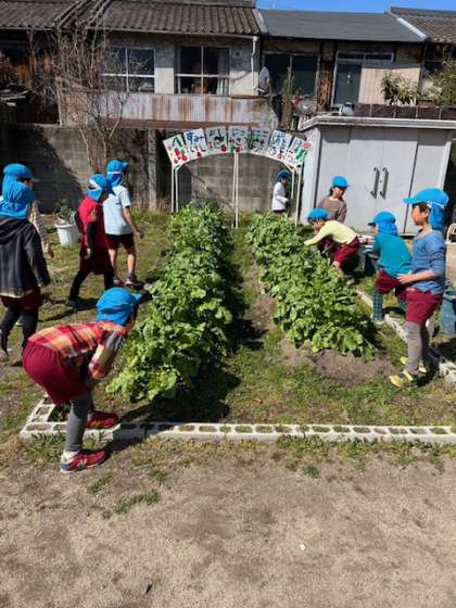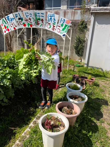 抜く時には、円を描くように揺らして動かしながら、「うんとこしょ!どっこいしょ!」と、まるで大きなカブの絵本のような掛け声が自然とあがりました。大人の拳ほどの大きさの大根がたくさん採れました。「明日のお弁当に入れてもらうわ」「おいしそうな匂いがする!」と、言い合っていました。