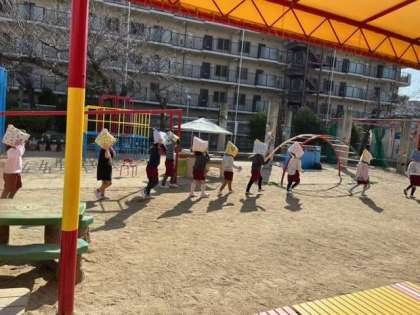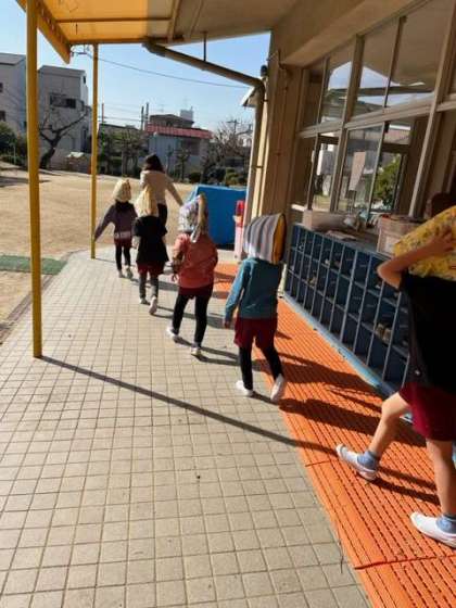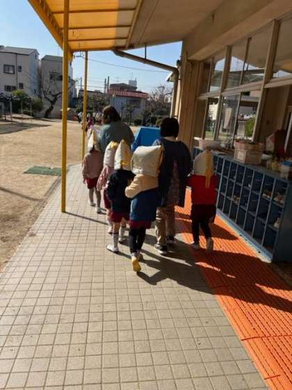 揺れがおさまり、防災頭巾をかぶって園庭に逃げるときも、落ち着いて避難できました。