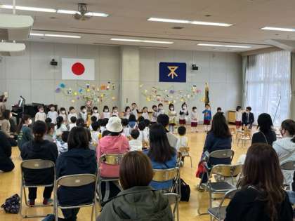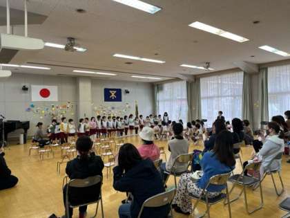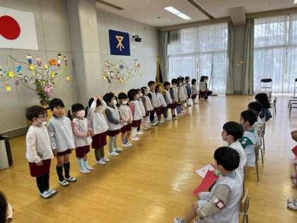 春の歌を保護者の方に聞いていただきました。あか組、もも組お互いによく聞いていました。1年間、楽しく過ごして、大きく強くなりましたね。来年も元気にいっぱい遊びましょう。