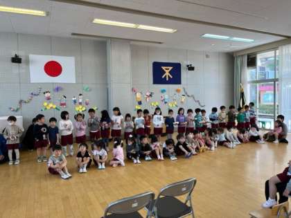 あお組とあか組で、明日入園してくるもも組さんにお祝いをしたいと準備をしています。歌を歌ったり、学期遊びをしたりします。