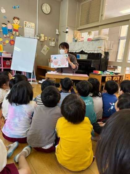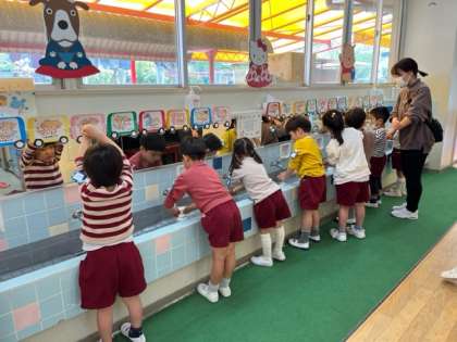 「あー、手洗わないと」「汚い手で、そのままご飯食べたら、お腹痛くなるで」と、スケッチブックシアターを見ながら、大きな声で話していました。その後、『あわあわ手洗いの歌』をかけながら、手洗いをしました。とても上手に洗っていました。