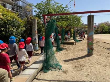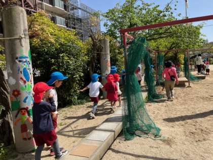 明日、園外散歩に行くときに手を繋いで歩く友達と一緒に園内を散歩しました。あお組はしっかりと手を繋いで、引っ張っていってくれました。明日が楽しみですね。