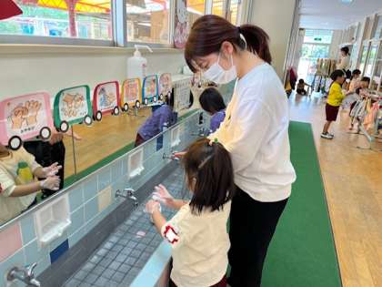 発育測定の後に、手洗いについての保健指導を行いました。あわあわ手洗いのうたを歌いながら、手を洗っていました。ていねいに、きれいに洗おうという気持ちが育っています。