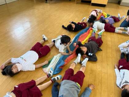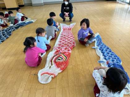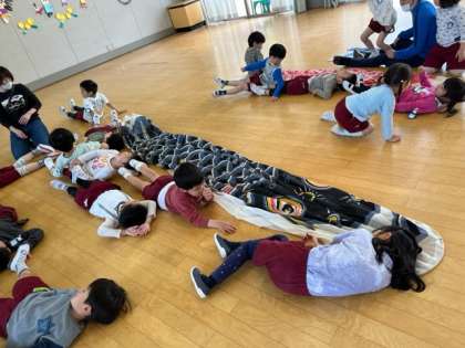 鯉のぼりの大きさがどれくらいだろうかと考えて、横に並んで何人座れるかな?寝転んだらどれくらいだろう?と自分の体を使って調べました。「4人いるな」「寝転んでみて」と言いながら、大きさを体感していました。