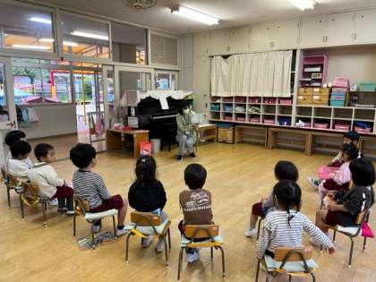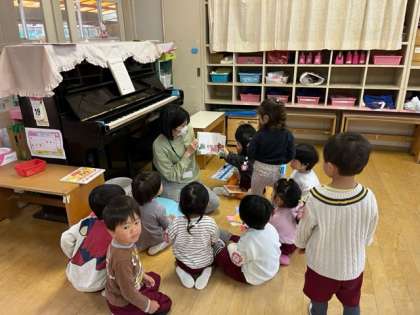 もも組の子どもたちは、先生に絵本を読んでもらうことが大好きです。