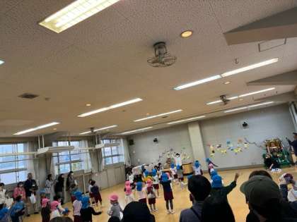 保育参観でお家の人に、いつも遊んだ後にみんなでしている『サンサン体操』を見ていただきました。普段も元気いっぱい体を動かしている子どもたちは、今日も元気に体を動かして、体操をしていました。