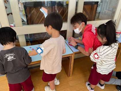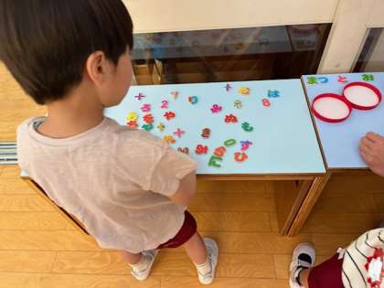 いろいろな文字や英数字を並べて、遊びました。自分の名前や知っている文字を集めたり、並べたりしました。
