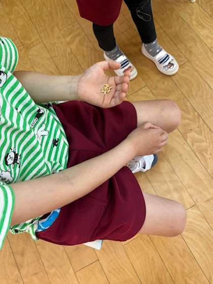 「お米の皮をむいてないものだよ」「すぐに芽が出てくる」「すぐには出てこないでしょう」「どんなのが出てくるのかな」と楽しみにしていました。