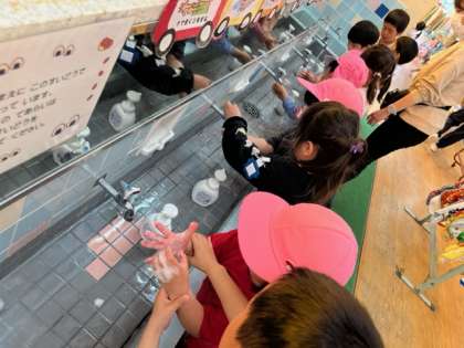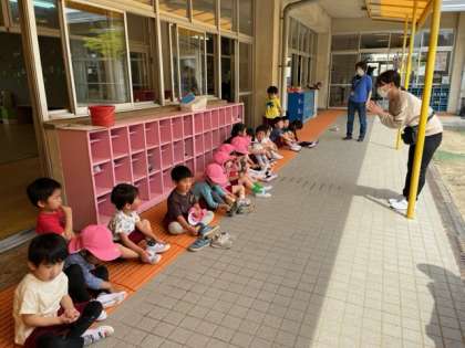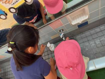 もも組に、遊んだ後、テラスで手を洗うことの大切さを、養護教諭がお話しました。あお組も一緒にいて、「遊んだ後は手を洗う」「水道に行く」と言って、手洗い場でもも組一人一人について、手の洗い方をていねいに教えてくれました。もも組も一生懸命に聞いて、手を洗っていました。