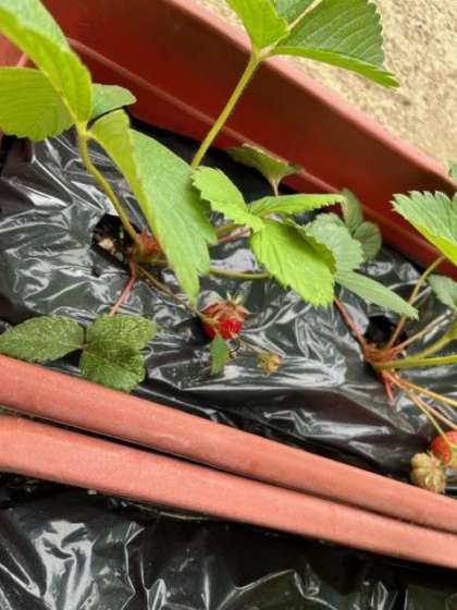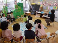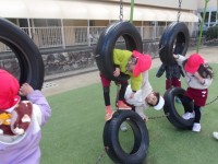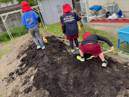 園庭のつるなしインゲン豆が芽を出し、金曜日にまだ青かったいちごが赤くなっていて、喜んでいました。畑では、冬の野菜の片付けも自分たちから来て手伝ってくれました。プランターのしたから、ダンゴムシやワラジムシがたくさん出てきて、大喜びでした。土を混ぜることも手伝ってくれました。