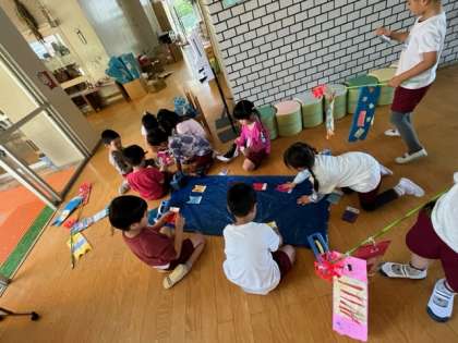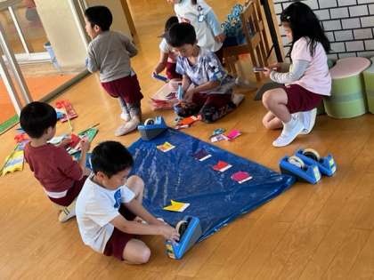 自分のこいのぼりができたので、大きなこいのぼりを作ろうと、自分たちで作ったものをうろこにして貼りました。