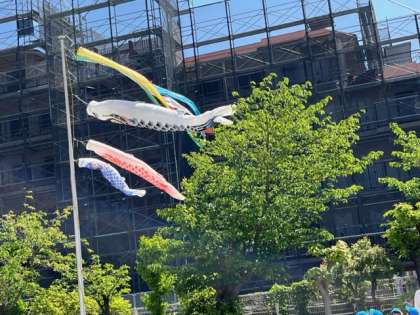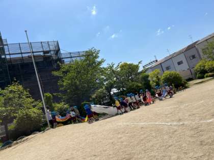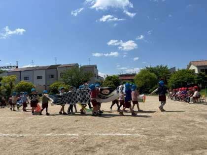 あお組がこいのぼりを持って、園庭を一周歩いて見せてくれました。ポールにあげた後、「こいのぼり」を歌っていると、泳ぎ出し、子どもたちの歌声は大きく元気になりました。