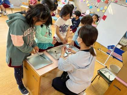 もう少ししたら耳鼻科検診があるので、どんな道具を使って体を見てもらうのかを知ろうと、触って確かめました。鼻や耳を見るには難しいね、でも大事な体だから見てもらおうね、怖がらなくていいよと話をしてもらいました。