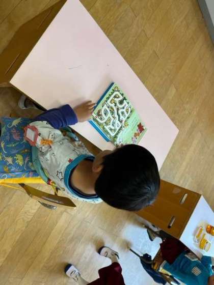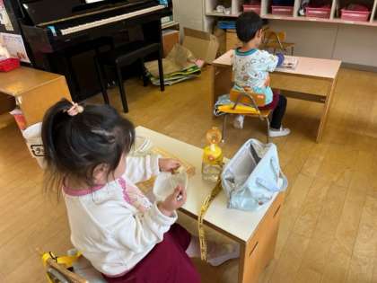 お弁当を食べて、片付けも自分で頑張って、片付けた後は『おなか休め』の時間で、好きな絵本をゆっくり読んでいました。