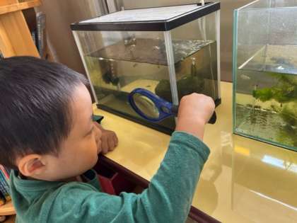 あお組が持っていた虫眼鏡を借りて、大好きな魚を見てみました。大きく見えると赤ちゃんの魚が大きく見えることを喜んでいました。