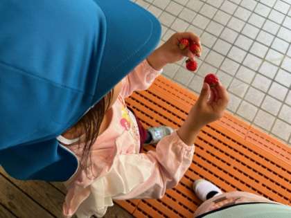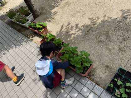 「先生、見て」「また赤くなってた」と自分たちで赤いイチゴを収穫してきました。「どこにあったん」と他の子も探しにいきました。真っ赤なイチゴは甘〜い、いい匂いがしました。