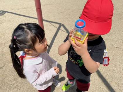 観察キット、大きく見えるね 公開日 2023/05/10 更新日 2023/05/10 園の様子 あか組は、初めてこどもの日の集いのプレゼントの観察キットを使って遊びました。捕まえた虫や花などを入れて、「大きくなってる」「こう見たらお腹が見えたよ」と、いつもと違った見え方に驚いていました。これからも、おもしろい発見がたくさんありそうです。楽しみですね。 いいね(0)