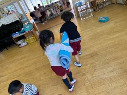 あお組は、お当番活動を頑張っています。朝は、ウサギやカメの餌やりや掃除、お弁当を食べた後は、床掃除をしたり、ゴザを片付けたりしています。