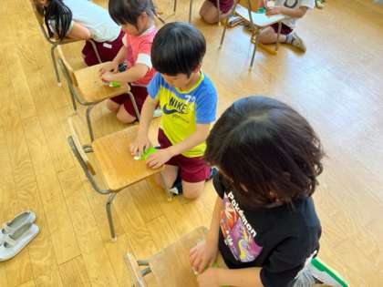ハートの折り紙は、こどもの日の時につくった兜より手順も多いので、あお組さんも悪戦苦闘!でも、難しかった分、出来上がった時の喜びは大きかったようです。