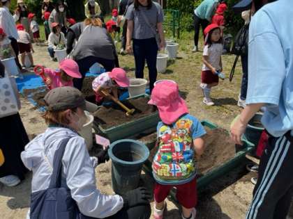 あお組は畑に、あか、もも組は植木鉢に野菜を植えました。