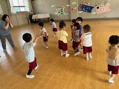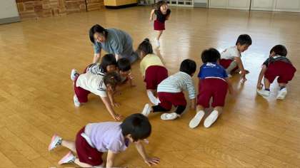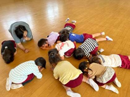 そっと先生のそばに集まってきたことから、忍者みたいと子どもたちで言い始めて、「猫ちゃん」に変身したり、リズム室の広い場所でゴロゴロと転がったり、石になってみたりして遊びました。よく話を聞いたり、思いを口々に言ったりしながら、楽しみました。