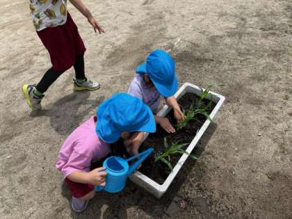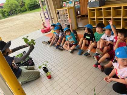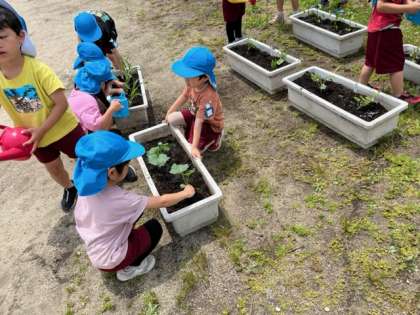 自分たちで植えた野菜と一緒に、他の野菜も育てることにして、あお組が植えてくれました。「これはとうもろこし」「スイカができるんやって」と言いながら、昨日の経験を活かして、上手に植えていました。
