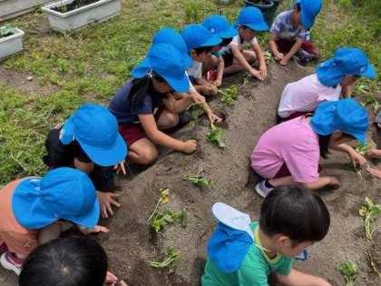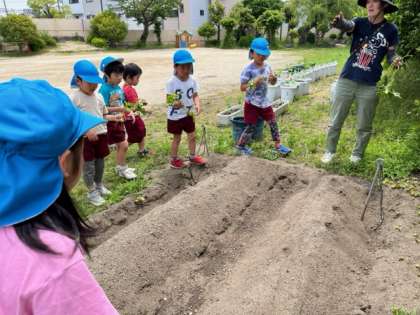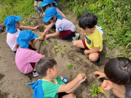 事業担当主事さんが作ってくれた新しい畑の畝にさつまいもを植えました。「これはは何かな」「見たときことあるな」と話しながら、苗を持ち、「どうやって植えるのかな」「こうしたらいいんじゃないかな」と子どもたちで考えて、植えました。どうなっていくか楽しみにしていきたいです。