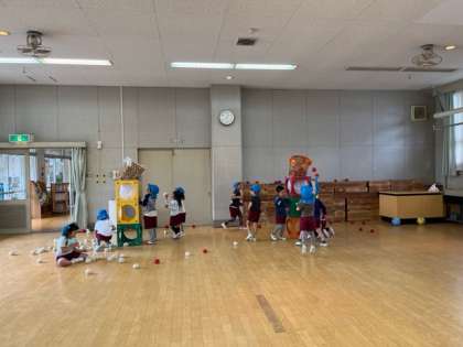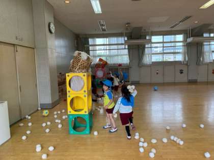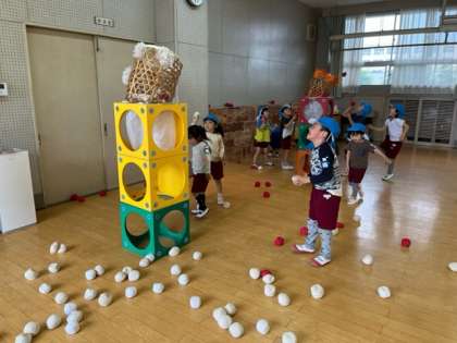 あか組が玉入れをした後、置いてありました。カゴに玉を投げ入れて遊び始め、赤白の対戦ゲームになり、みんなで対戦しながら何度も楽しみました。
