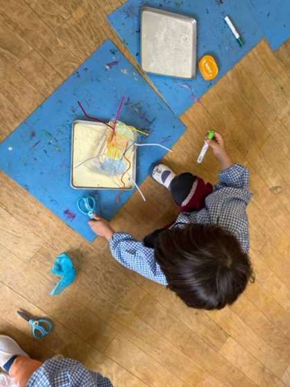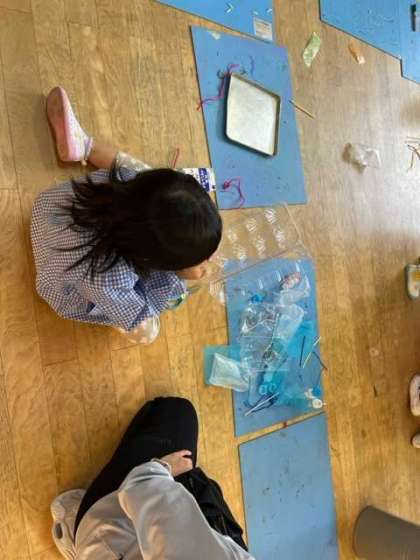 「海の生き物作ってる」「これ、にじいろのクラゲ」「ぼくが考えてん」「私はかわいいの作りたい」といろいろな素材を組み合わせたり、テープでつけたり外したりしながら、海の中のイメージを広げ、想像しながら、楽しそうに作っています。