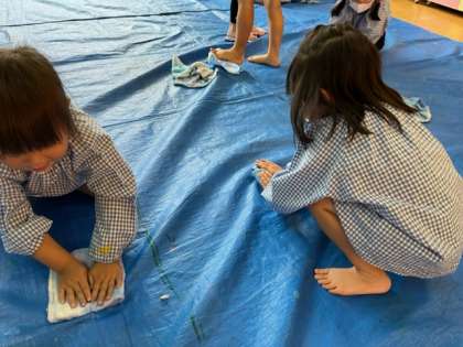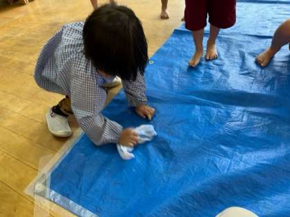 楽しんで海を作って、満足した子どもたちは、片付けも自分たちで「いっぱいついてる」「きれいになったよ」と頑張って拭き掃除をしていました。
