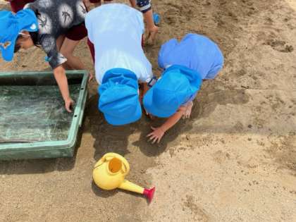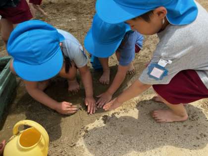 花に水をあげながら、水をどんどん触っているうちに、砂場にも水を流したくなり、流してみました。「しみていくと思う」と言って、流れた水を見ていると、少し流れていきました。大喜びで、「裸足になってくる」「掘ろう、道作ったら流れるよ」と、手で掘ったり、水が流れていく道を歩いたりして、砂場での水遊びを存分に楽しみました。