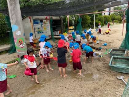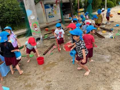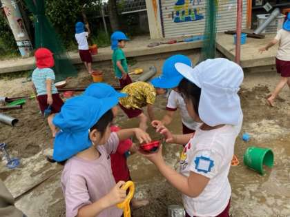 昨日楽しそうだと見ていた子どもたちも参加して、あお組、あか組が今日も水を流して、道を掘ったり、樋に水を流したりして遊びました。どろんこになって遊んでいました。