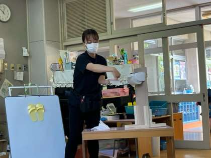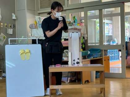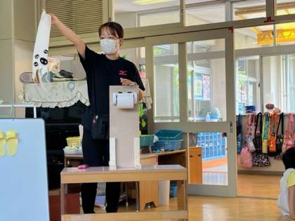 トイレットペーパーにもインタビューをしました。「ぐちゃぐちゃで、濡れちゃうし、嫌なんだよ」と言うと、子どもたちも「下についてばい菌がついてしまう」「ぐちゃぐちゃで嫌だ」と言い、トイレットペーパーを手に乗せて畳み、蓋をおさえて切ったら、きれいに切れることを教えてもらい、子どもたちもよく聞いていました。