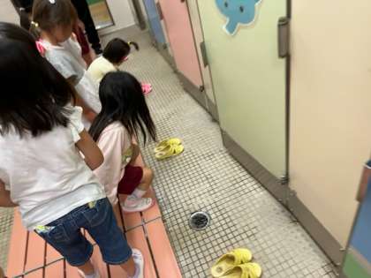 保健指導の後、今のトイレはどうなっているかなということになり、見に行き、昨日話を聞いたあお組もいて、一緒にトイレのスリッパを並べていました。いつも使いやすいトイレは気持ちいですね。
