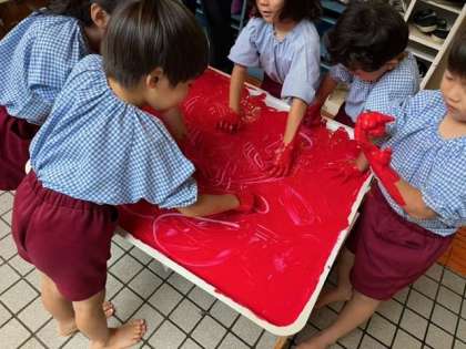 ぬるぬるする感触の指絵の具で遊びました。キャーキャー言いながら、大喜びして、絵の具を触っていました。「気持ちいい」と言って、笑顔で、体全体を使って、楽しんでいました。