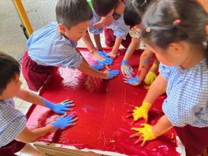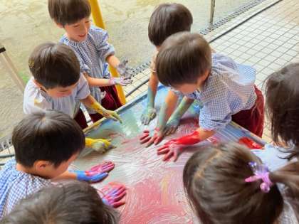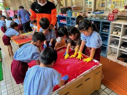 「赤と青を混ぜたら、紫かな」「うわー、こんな色になってきた」と、手も腕も絵の具をつけながら、色の変化を楽しんでいました。
