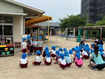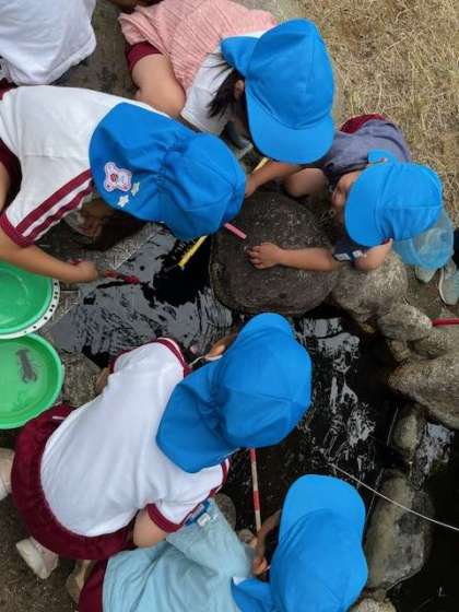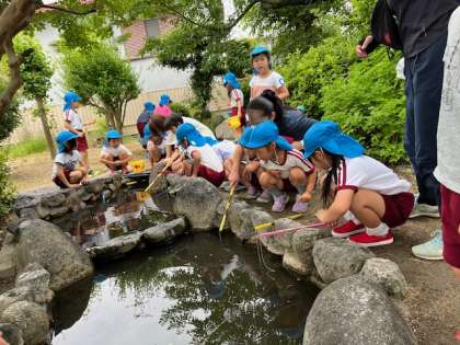 今回は玉出幼稚園の年長さんがザリガニ釣りに来てくれました。ザリガニ釣りの約束を伝えた後、一緒に手を繋いで、池に案内しました。どのあたりに大きなザリガニがいるか、じっと待っておくことなど、自分たちが経験した中で知っていることを友達に知らせていました。今日初めて出会ったのですが、お互い一生懸命にコミュニケーションをとり、ザリガニ釣りを楽しんでいました。玉出幼稚園の子どもたちが、ザリガニが釣れた時の喜びを感じている様子やザリガニを持てるようになった喜びを感じ取り、自分たちもザリガニを持ってみると挑戦している子どももいました。楽しくて、玉出幼稚園ってどんなところかな、また遊びに行かせてほしいと言っていました。ザリガニを通して、ふれあいを楽しむことができました。