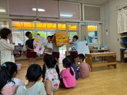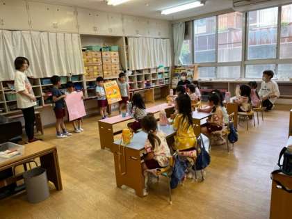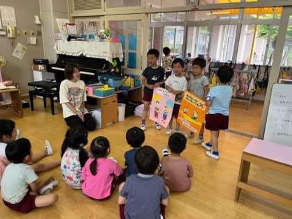 自分たちで貼り絵をして作ったものを使って、安全ポスターにしたものを持って、もも組やあか組の保育室を回って、知らせてくれました。