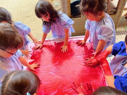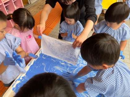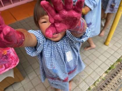 もも組の様子を見ていたあか組さんは、してみたくて、さっそくアトリエ着に着替えてやってきました。ぬるぬるの感触を楽しんだり、赤と青を混ぜると、何色になるのかな?」と友達と考えてしてみて、「やっtり紫や」と納得していました。