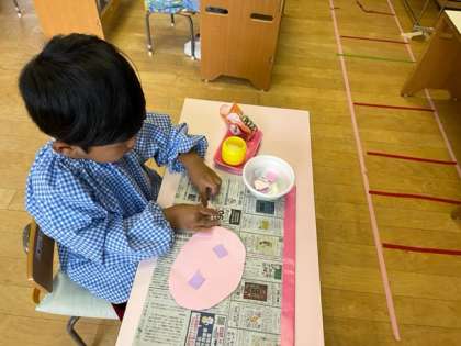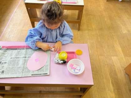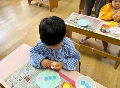 もも組は初めてのりを使って小さなアジサイの花を貼り付けていきました。のりを指の先に少しつけて、ひとつづつ丁寧に貼っていました。お部屋にたくさんのアジサイの花が咲きました。
