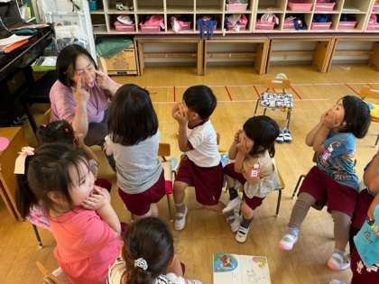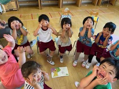 もも組の子どもたちが初めは数人で集まって、顔を見合わせて、笑っていました。そこへ、「入りたい」と集まってきて、だんだんと増えていきました。そして「あかんべノンタン」を持ってきて、「読んで!」となり、みんなで絵本を囲んで、読んでいきました。子どもたちも「あっかんべー」としては大笑い!「先生にもあっかんべー」としながら、みんなで楽しく読んでいきました。