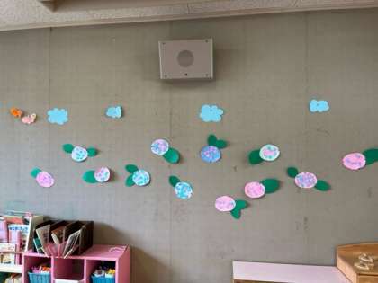 子どもたちが作ったアジサイを壁面にして、お部屋にアジサイの花がたくさん咲きました。