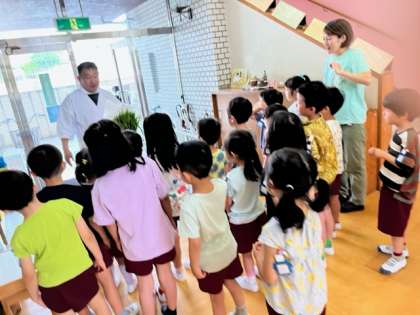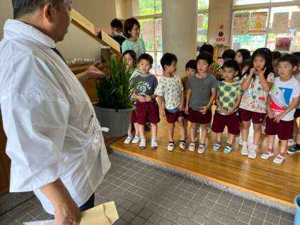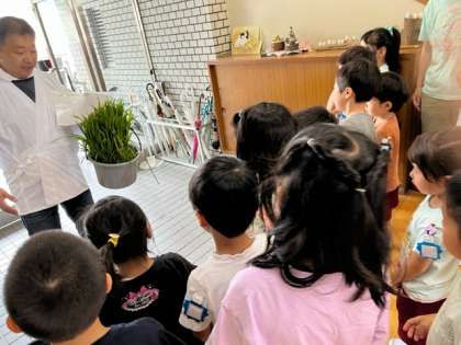 昨日のお田植えの稲の苗を住吉大社さんが持ってきてくださいました。昨日、お田植え踊りに参加したり、お田植えを見に行った子どもたちもいて、「お米?」「お米の葉っぱ?」と言っていました。「お米の赤ちゃんだから大事に育ててね」と教えていただきました。