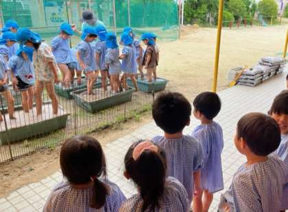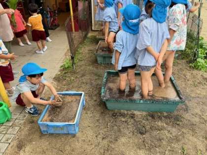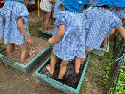 用意していた土に水を入れ、足で踏んで水と馴染ませました。住吉大社さんでは、牛さんが踏んで土を耕すということを教えてもらい、「モー、モー」と言いながら土を踏みました。テラスから見ていたあか組も一緒に「モー、モー」と楽しんで見ていました。もも組も応援に来てくれていました。