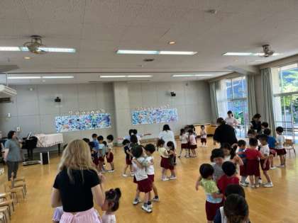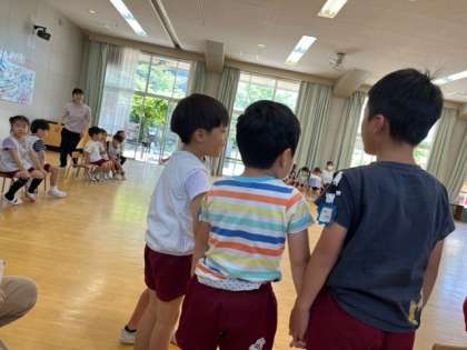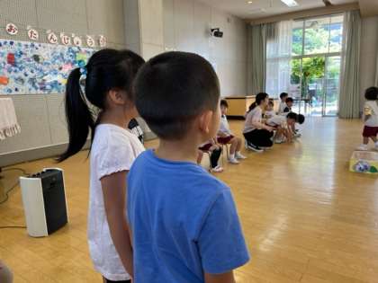 今回の誕生会もあお組が司会をしてくれました。緊張する中で、ドキドキ友だちと手を繋ぎながら頑張って言葉をいっていました。