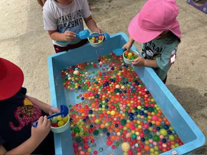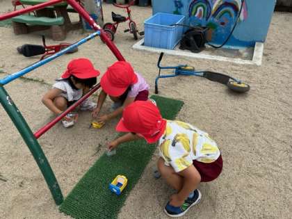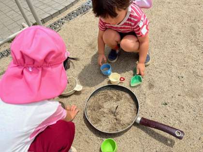 スーパーボールすくい、観察キットを使ったアリの観察、砂で作ったケーキやジュースで誕生日をお祝いなど園庭での遊びを楽しんでいました。